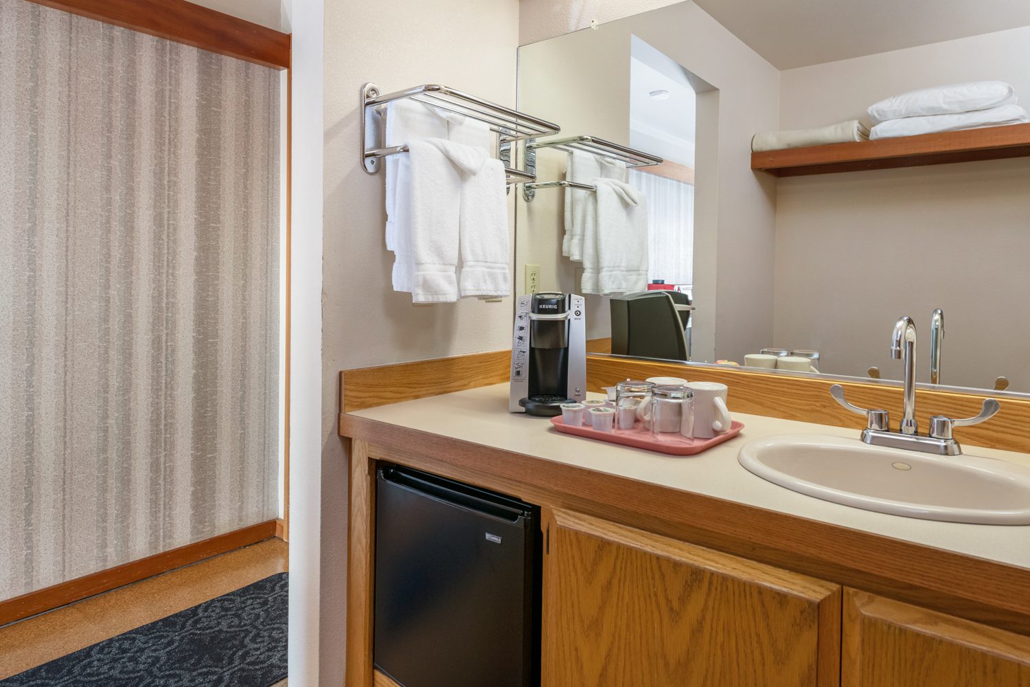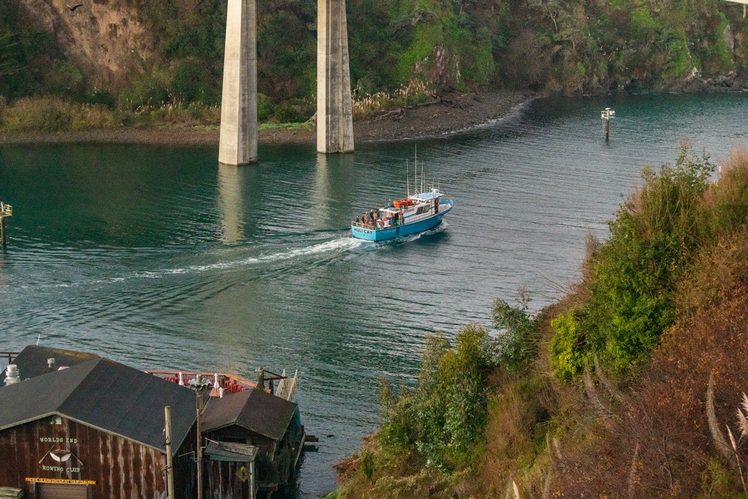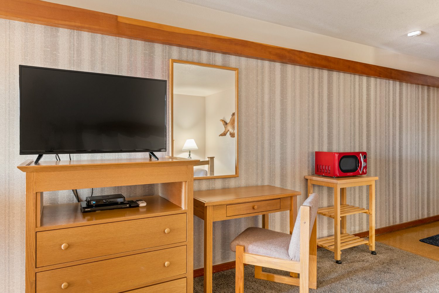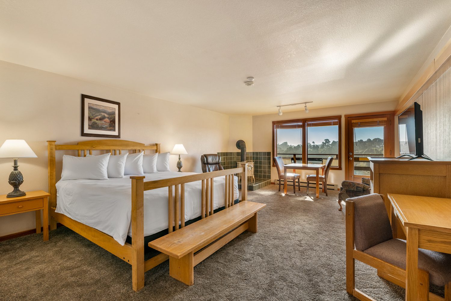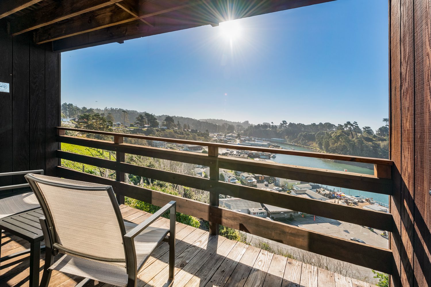 This oversized room with a single king bed and fireplace has a panoramic view of the beautiful Noyo Harbor from your balcony.