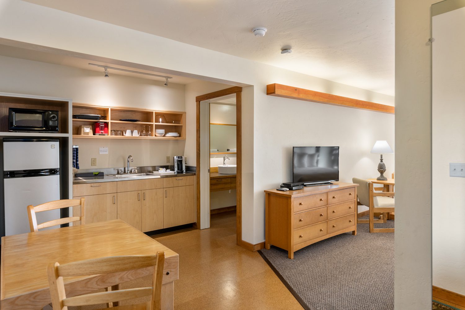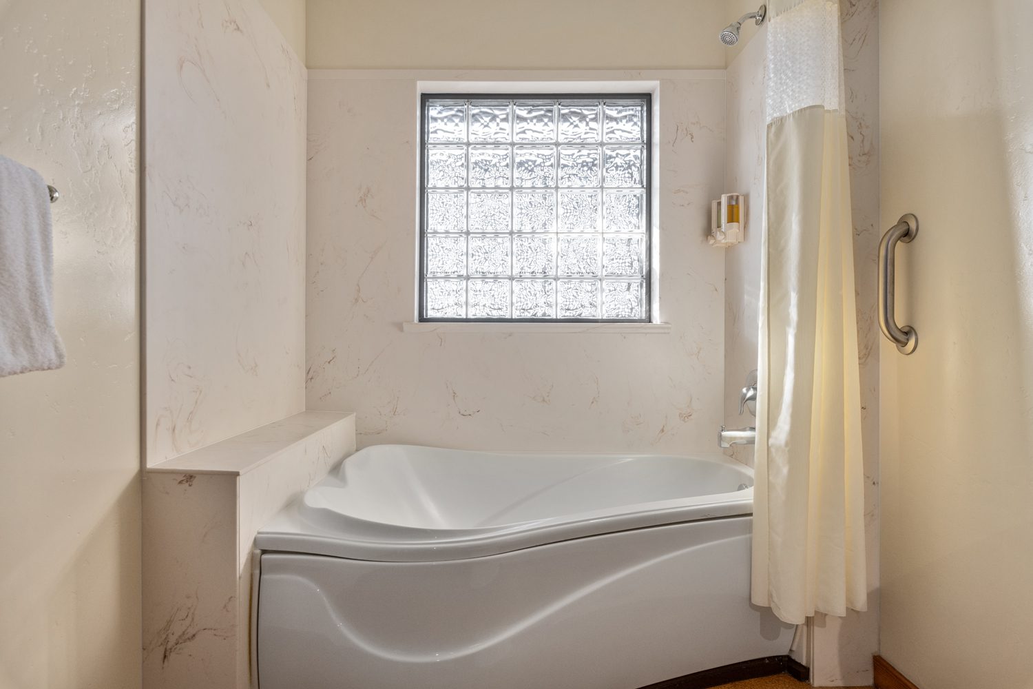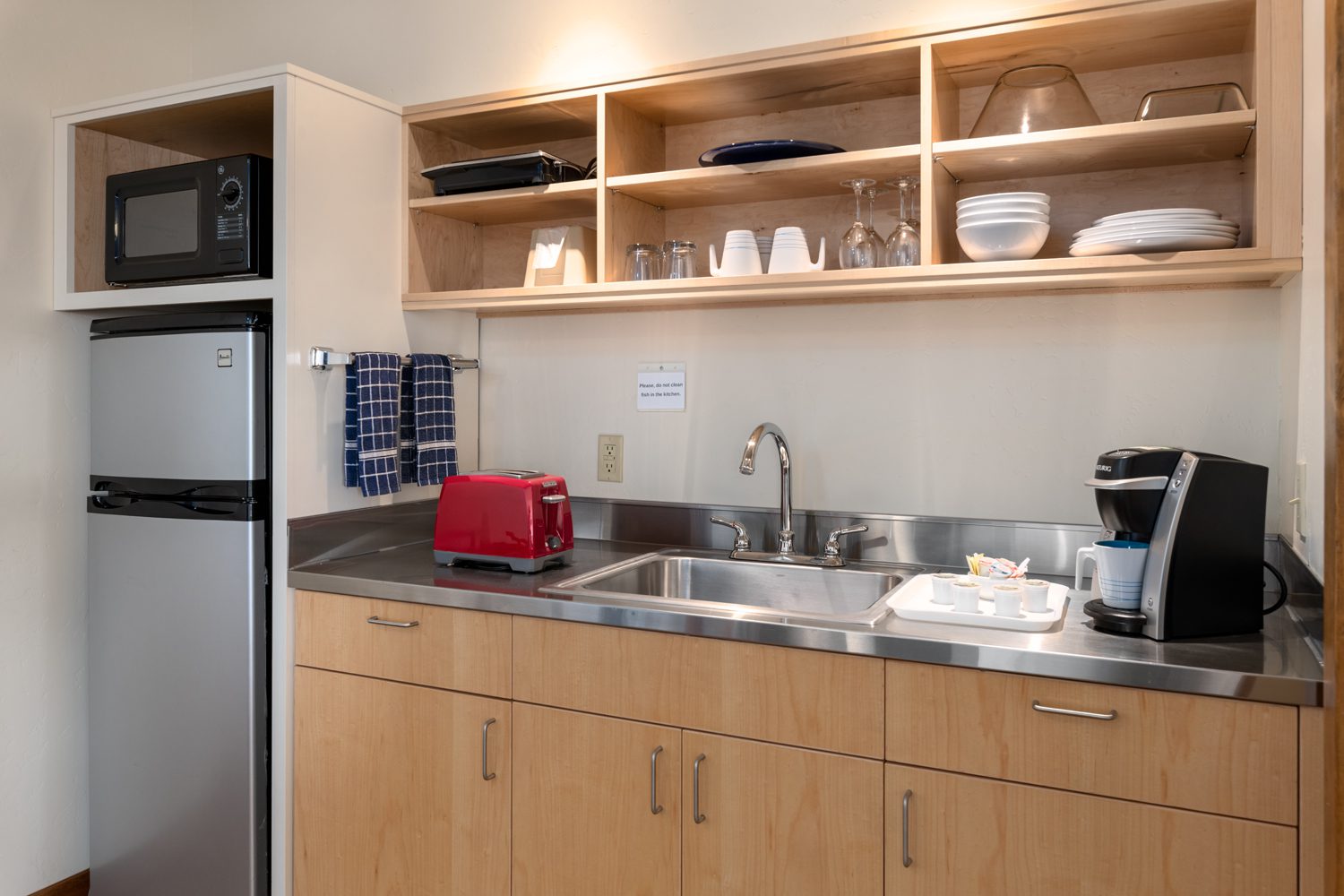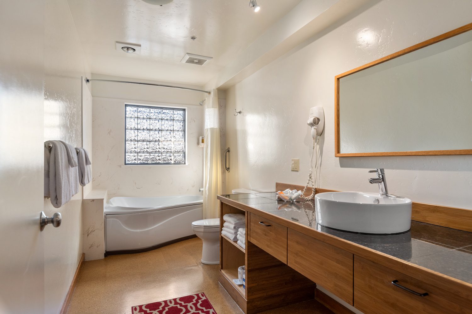 Our Ground Floor Kitchenette with Two Queen Beds includes all kitchen amenities and an oversized bathroom. Please request a tub or shower and we will attempt to accommodate the request. This room has an expanded balcony with zero gravity chairs overlooking Noyo Harbor.