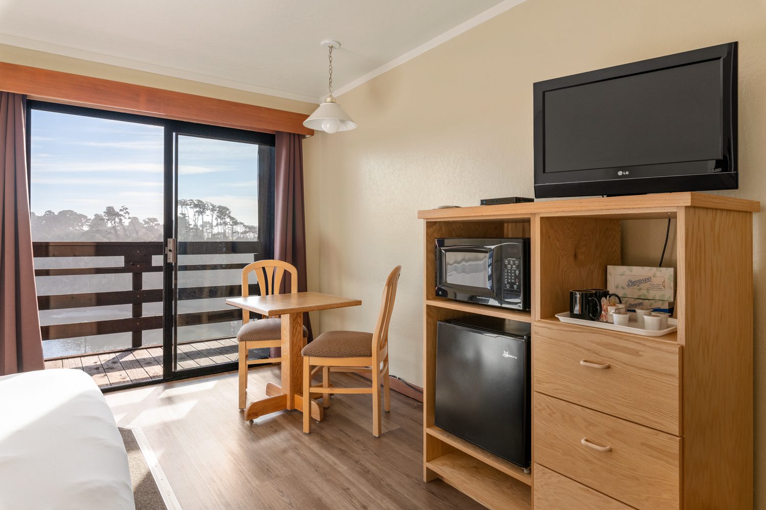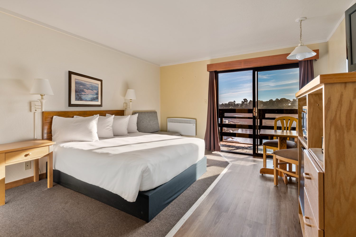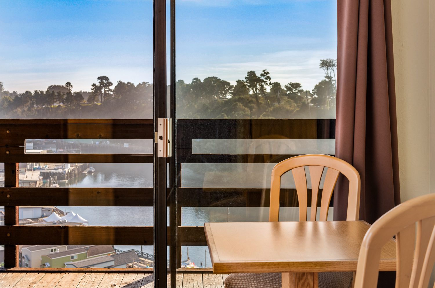Our ADA compliant room has a queen bed that is 22″ high and a pull out twin bed. The room features a view of the Noyo Harbor. This room also has an ADA accessible bathroom including roll in shower with seat. Our lobby also provides an accessible ramp and all entryways and walkways to the room are unobstructed. This room is reserved only for those with disabilities requiring accessibility.